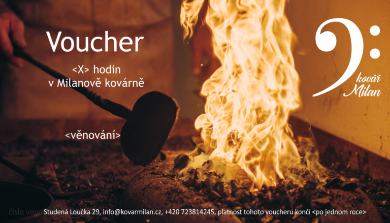 Pokud si chcete vyzkoušet práci u mě v kovárně (pod mým vedením), nebo tenhle zážitek dopřát někomu blízkému, můžete si objednat voucher. Na konkrétním výrobku se domluvíme individuálně - přijďte si vykovat svůj vlastní meč, věšáček, přívěsek, nebo cokoliv vás napadne.